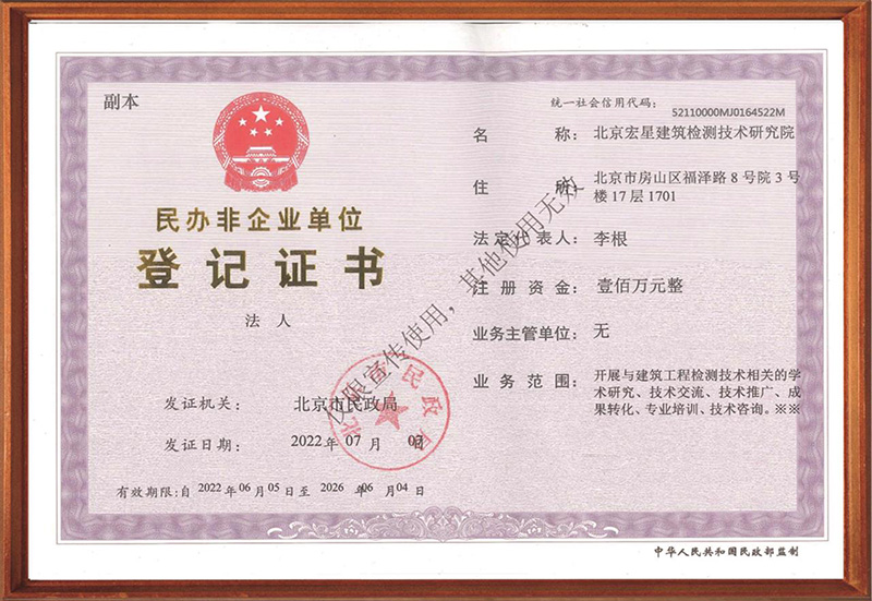 2018年取得北京市民政局颁发的民办非企单位登记证书(北京宏星建筑检测技术研究院)