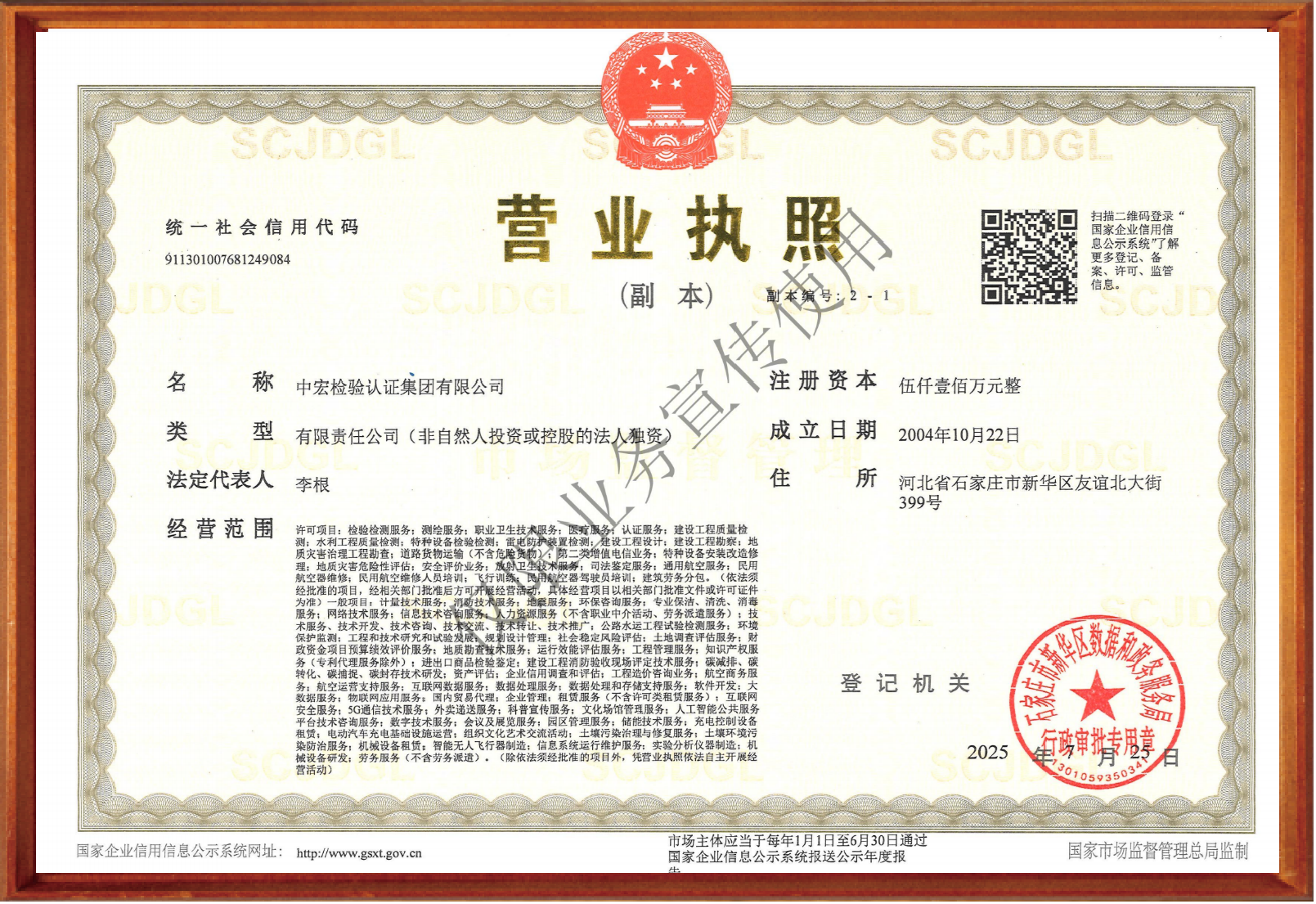 中宏检验认证集团有限公司,简称中宏集团(CHIC),原河北宏星检测公司,2004 年点燃梦想、辉煌启程,2017年升级为宏星集团,2020年更名为中宏集团。公司是集检验检测,认证认可,计量标准,特种设备,知识产权等质量基础设施服务的一站式综合服务机构以及为建设工程提供可研报告,环境评价,水土保持,工程勘察,工程设计,工程监理,工程检测,工程验收等工程全过程服务以及低空经济发展为一体的检验认证综合集团。公司技术力量雄厚,在职员工500余人,其中专业技术人员400余人,中高级职称人员200余人,各类国家注册岩土工程师、国家注册结构工程师、国家注册测绘工程师、消防工程师等100余人,大学本科以上学历占80%,是技术密集、人员年轻化且专业搭配合理的新型企业,还拥有各领域尖端专业检测仪器4500余台套,总价值九千多万元